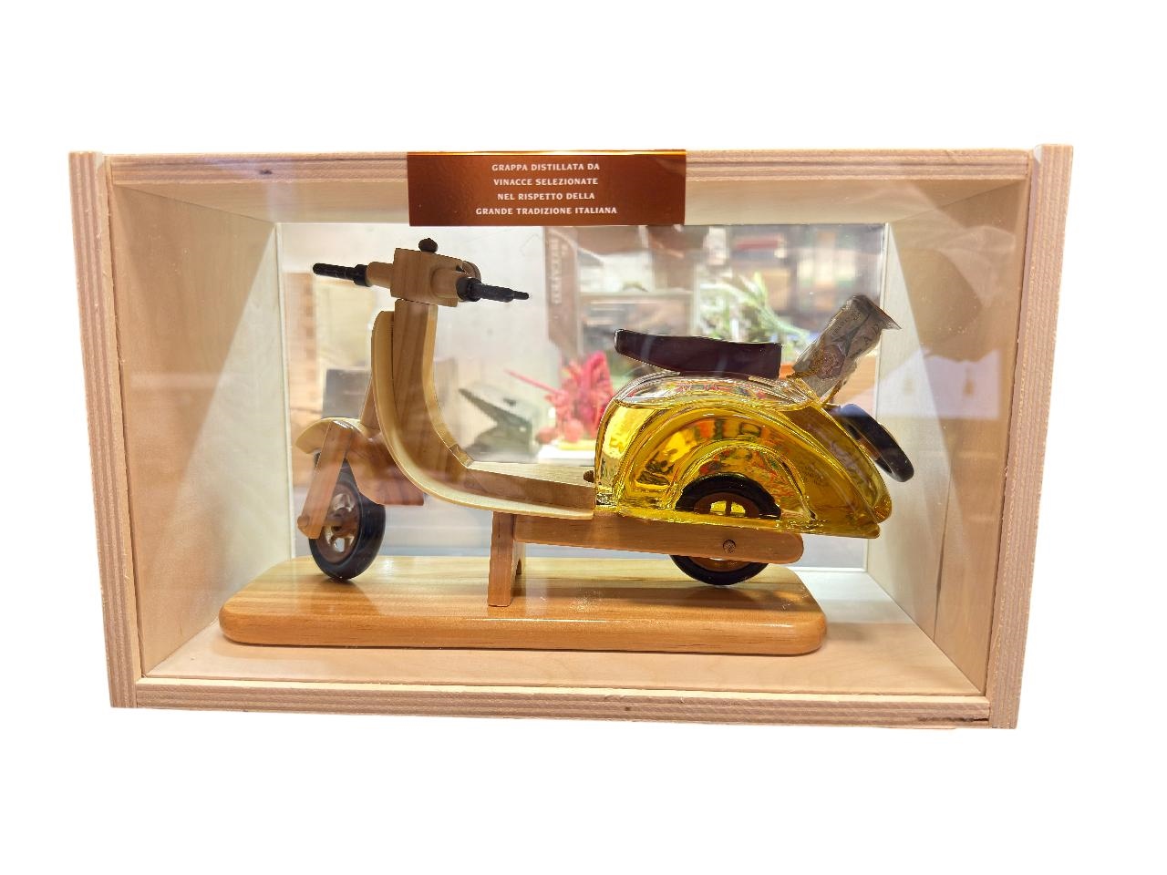 La Grappa è contenuta all'interno di una bottiglia particolare, a forma della mitica Vespa.