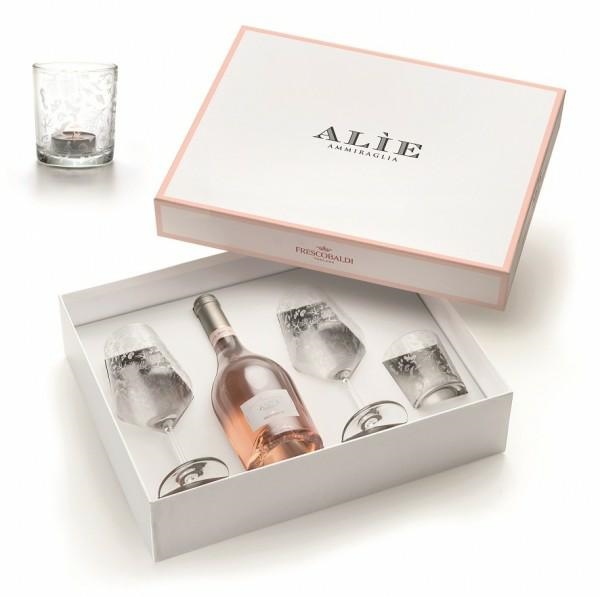 Confezione bottiglia + portacandele. Il Rosato Alìe della Tenuta Ammiraglia racchiude tutta l’atmosfera marina e mediterranea del territorio costiero della Maremma, coniugandoli in termini di delicatezza e raffinatezza espressiva. Le uve Syrah conferiscono un colore rosato molto piacevole alla vista senza bisogno di macerazione, ma solamente grazie ad una pigiatura soffice diretta. La fermentazione avviene in vasche d’acciaio a temperatura controllata, senza svolgimento di malolattica. L’aggiunta di minime quantità di Vermentino contribuisce in maniera impeccabile a quell’equilibrio fresco-sapido che contrassegna questa etichetta. Un breve affinamento in vasche d’acciaio e poi in bottiglia completa in processo produttivo, garantendo la valorizzazione delle doti più giovanili, semplici, nitide e floreali di questo vino rosato Frescobaldi. Alìe Ammiraglia Frescobaldi è sinonimo di delicatezza, eleganza e nitidezza. Si presenta in una signorile tonalità rosa pallido che ricorda il colore di certe rose antiche in un giardino ben curato. Dal calice si librano a mezz’aria soffuse nuance di fiori e fragoline, agrumi e frutta fresca, amalgamate in un sottofondo minerale e salino. Al palato manifesta equilibrio, armonia e agilità di beva, dispensando con grazia e mobile aplomb echi di agrumi, fiori bianchi.