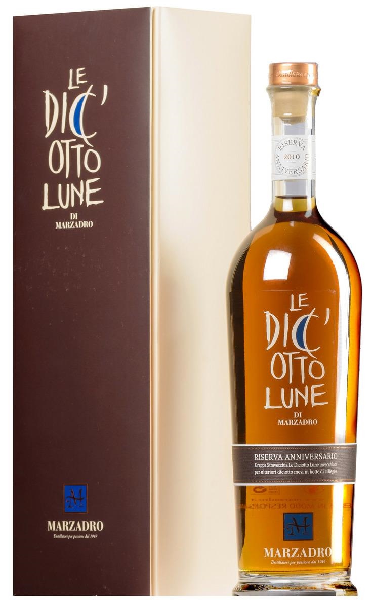 Formato bottiglia: cl.70 Gradazione alcolica: 42% vol. Prodotto in Italia. Con astuccio. La Famiglia Marzadro, grazie alla decennale esperienza nell’invecchiamento, propone un'edizione speciale e limitata, della sua prima Grappa Stravecchia Le Diciotto Lune, proveniente dalla distillazione a Bagnomaria in alambicco discontinuo di 5 vinacce trentine quali Marzemino, Teroldego, Merlot, Moscato e Chardonnay. “Riserva Anniversario” nasce da un periodo di invecchiamento di diciotto mesi in piccole botti di Rovere, Ciliegio, Frassino e Robinia e un periodo aggiuntivo di diciotto mesi in sole botti di Ciliegio. L'ulteriore affinamento evidenzia un contrasto Grappa-Legno più netto e dona alla tradizionale Le Diciotto Lune, dal profumo etereo e dal gusto rotondo, un sentore di Ciliegio accentuato. Un connubio di sensazioni che regalano un'esperienza unica.