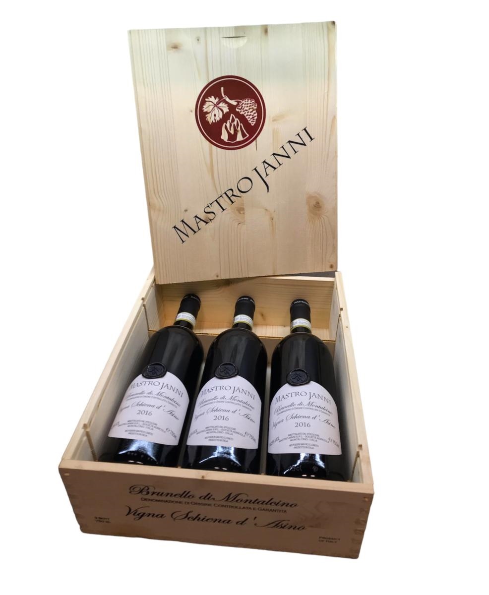 Cassetta legno con 3 bottiglie cl.75 Tipologia: DOCG Uvaggio: 100% Sangiovese (Brunello) Affinamento in botte: 42 mesi in botti di rovere di Allier da 16 hl. Affinamento in Bottiglia: 12 mesi. Colore: Rosso intenso, fitto e trasparente. Al naso: Prugna matura e frutti di bosco con note di macchia mediterranea. In bocca: Attacco nobile e austero nella progressione, compatto, serrato e sapido, nato per affrontare il tempo. Abbinamenti: Anche solo, in compagnia. Produzione: 6.000 bottiglie. Le piante vecchie della vigna ci regalano la massima espressione del Sangiovese autoctono, offrendoci un vino di grandissima personalità e tradizione dove un superbo e variegato bagaglio aromatico si inserisce su un tessuto tannico solido, ma anche fitto e serrato, che insieme ad una acidità in fragrante evidenza è garanzia di superba potenzialità di invecchiamento.