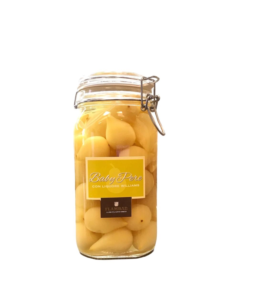 Gradazione alcolica: 16% vol. Vaso di baby pere con liquore al Williams. Formato: 1670 gr. Flambar da cinquant’anni è presente nelle più rinomate pasticcerie con la sua gamma di impareggiabile frutta al liquore. La nostra frutta viene accuratamente selezionata e calibrata, raccolta fresca in stagione, per poter dare nella lavorazione tutto il suo meglio. Un nome che è ormai leggenda, una garanzia di qualità, di raffinatezza ed eleganza, cura attenta della forma ma soprattutto della sostanza. Puntiamo sulla qualità e non sulla quantità, secondo la nostra filosofia: i migliori prodotti per i palati migliori.