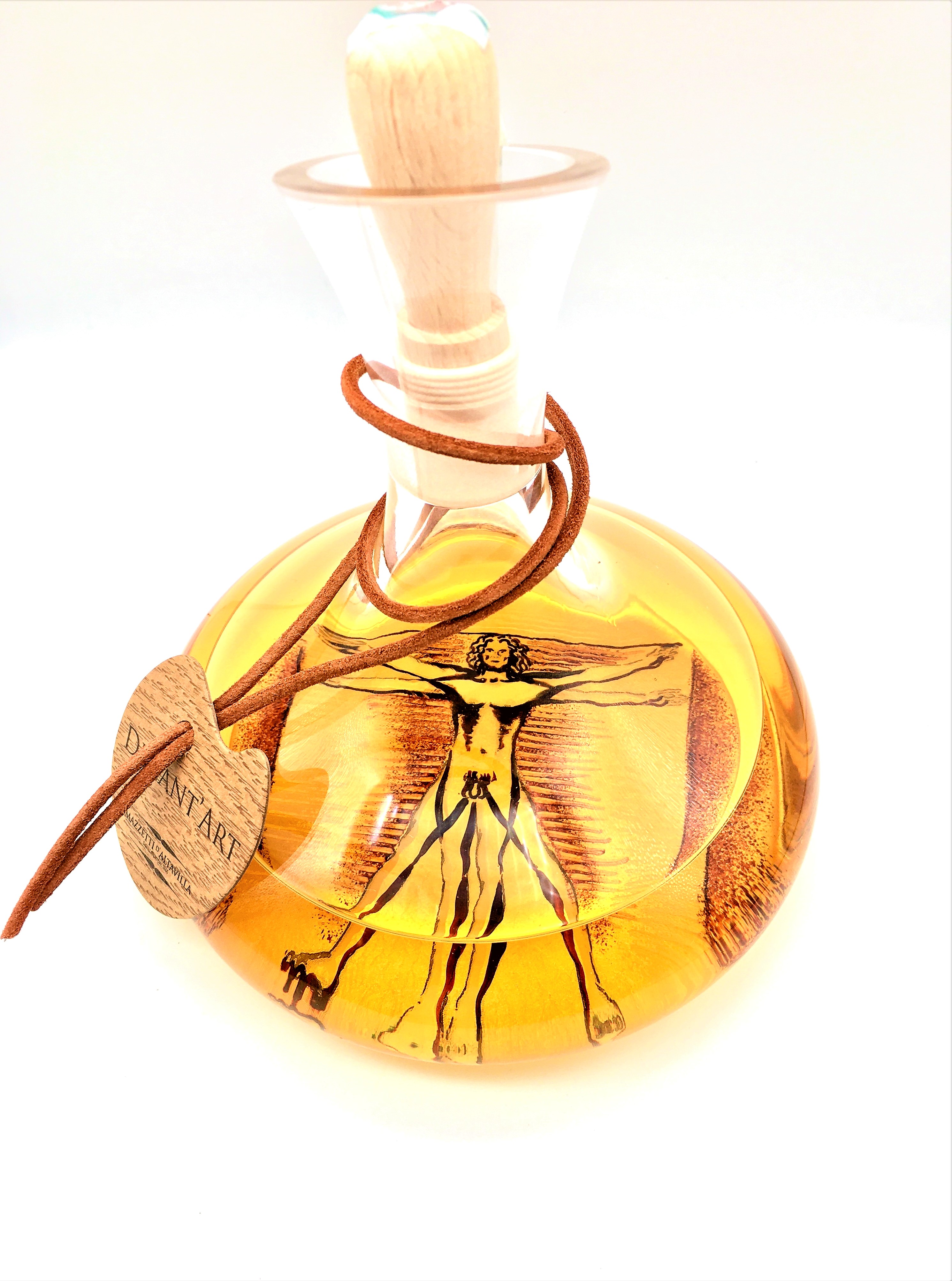 Bottiglia: cl.70 Vitigno: Moscato Valutazione olfattiva: intensa, rotonda, aromatica. Confezione: 2 calici tumbler, Cassetta in legno. Gradazione: 43% vol. Provenienza: Monferrato Astigiano. ‘L’uomo Vitruviano” di Leonardo Da Vinci dipinto a mano su questo decantatore in vetro cristallino soffiato. Un articolo da collezione, un articolo speciale per un occasione altrettanto speciale! Un pensiero da concedersi e da regalare, per decantare in compagnia un distillato d’eccellenza grazie ai due calici abbinati al prezioso decanter. Il tutto racchiuso in un pregiato cofanetto in legno.