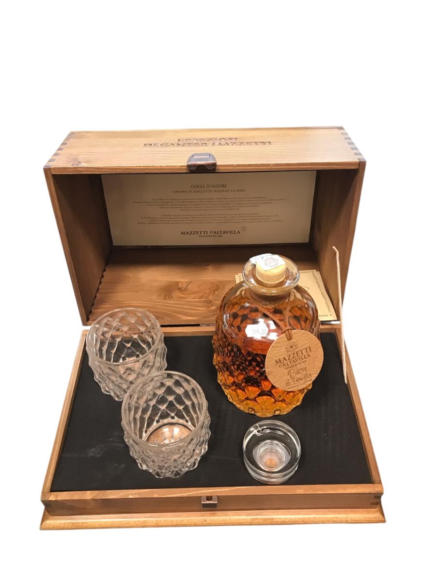 Una pregiata Grappa di Dolcetto Riserva che riposa per ben tredici anni in nobili essenze lignee. Nasce un distillato particolarmente ricco di sfumature cromatiche, profumi complessi e persistente aromaticità. La Grappa di Dolcetto Riserva trova in questo decantatore il suo alleato perfetto, capace di esaltarne, con la sua preziosità, le virtù sensoriali. Attraverso gli appositi calici il momento della degustazione si trasforma così in un atto di pura meditazione.