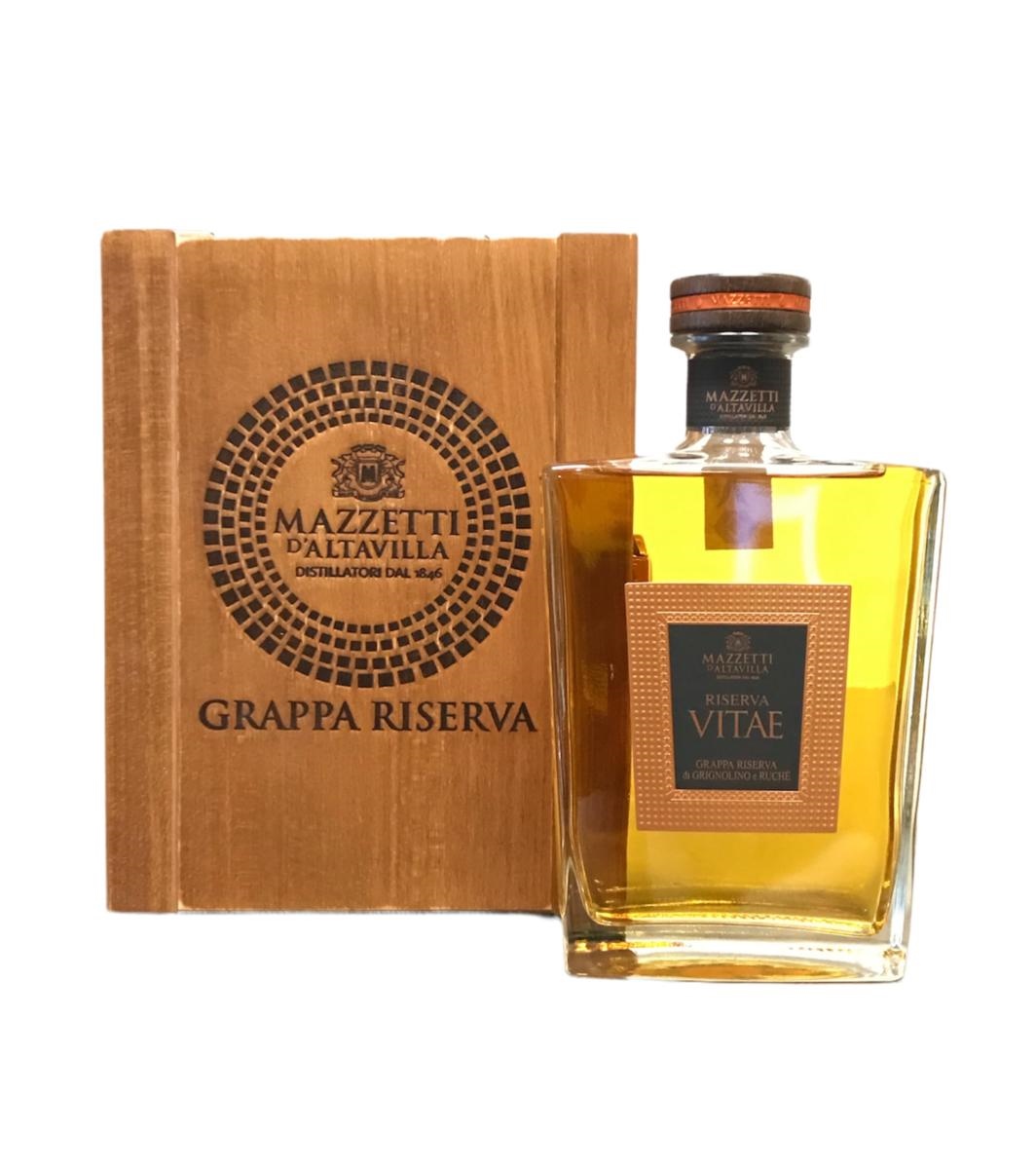 Grappa di Ruchè e Grignolino: una riserva più che autoctona in grado di regalare intensità e profumi che rispecchiano il territorio del Monferrato. Fra i vitigni peculiari del Monferrato il Grignolino e il Ruchè si distinguono per la loro tipicità di sentori e aromi, dando vita ad una Grappa tendenzialmente secca ma dai profumi intensi e persistenti. Invecchiata per oltre 18 mesi, la Riserva Vitae rilascia sentori intensi e profumati che la rendono unica. PROVENIENZA: Basso Monferrato VALUTAZIONE OLFATTIVA: profumazione impetuosa e persistente con sentori floreali di viola CARATTERISTICHE: colore ambrato, Grappa secca ma amabile GRADAZIONE: 43%