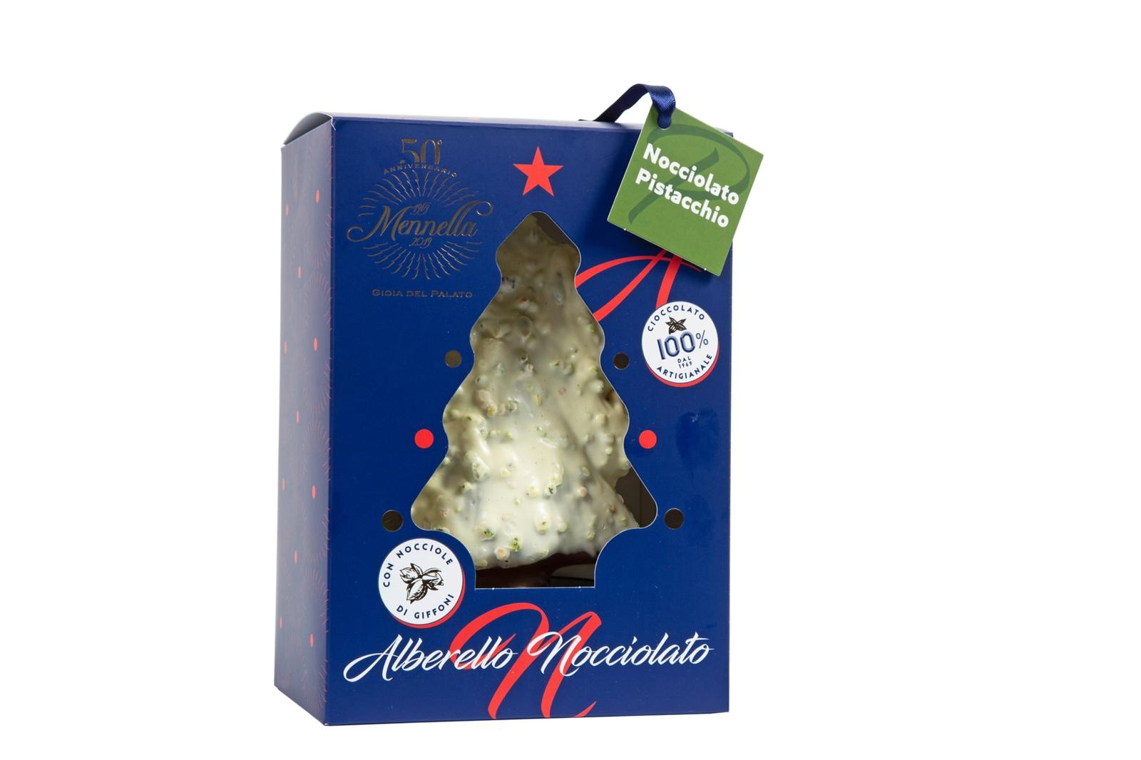 Alberello al Cioccolato al latte ricoperto da Cioccolato al pistacchio Nocciolato con granella di Nocciole di Giffoni IGP e pistacchi.
