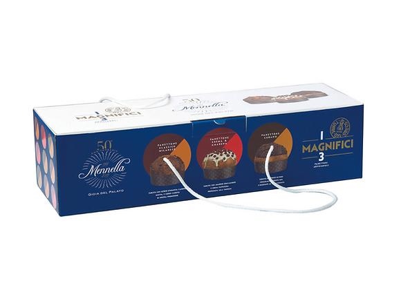 Contiene 3 Panettoni Artigianali da 500g: -Panettone Artigianale Classico Milanese, farcito con cubetti d'arancia e cedro canditi di nostra produzione (500gr); -Panettone Artigianale Crema & Amarena farcito con amarene semi-candite di ostra produzione e crema pasticcera profumata alla vaniglia (500 gr); - Panettone Artigianale Cubano farcito con pepite di puro Cioccolato Fondente 60% e inzuppato al Rhum Jamaica, ricoperto con glassa al Cioccolato Fondente (500 gr).