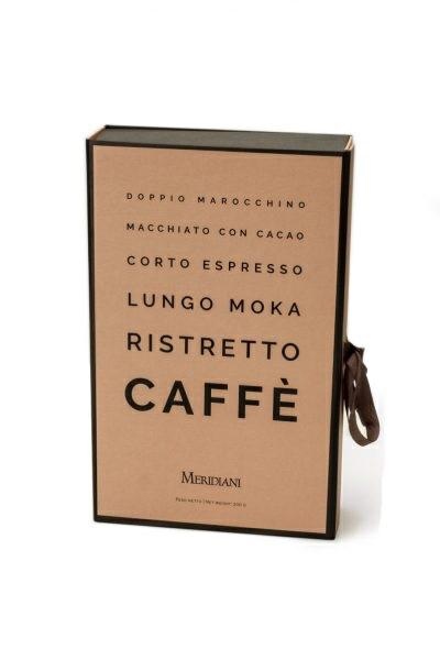 CONTIENE: 2 Astucci 50g cad. di ricercate selezioni di caffè, 1 Vasetto di Fave di Cacao, 1 Vasetto di Fave di Cacao allo zenzero, 1 Vasetto di Zucchero di canna, 1 Cucchiaino/molletta dosatore