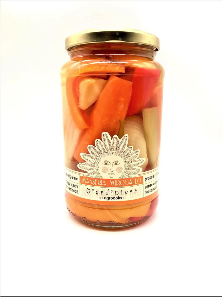 Gr.530 Raccolti al giusto grado di maturazione, gli ortaggi vengono selezionati, tagliati a filetti o a pezzi, scottati in soluzione acidulata, e infine invasettati ed insaporiti dalla prolungata maturazione nella concia agrodolce. Così preparati dal fresco, i nostri agrodolci conservano inalterato tutto l’apporto nutrizionale originario: il sapore, il profumo, il gusto e la croccantezza ricordano le conserve preparate in casa secondo le antiche tradizioni mediterranee.