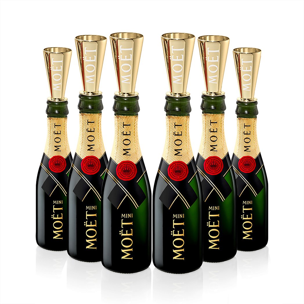 Confezione 6 mini Moët & Chandon + 6 mini flutes. Vitigni: pinot nero 40%, pinot meunier 30%, chardonnay 30% Temperatura di servizio: 6/8 °C Abbinamenti: antipasti e primi piatti di mare. Note di degustazione: Giallo paglierino dorato, dal perlage fine e persistente. Al naso esprime belle ed intense note di mela verde, di agrumi, di fiori bianchi impreziosite da una decisa traccia minerale, quasi gessosa. Al palato è suntuoso, fresco, seducente, molto lungo e piacevolissimo. Abbinamenti: Ottimo aperitivo, ben si abbina a sushi e sashimi, capesante, ostriche, frutti di mare in generale.