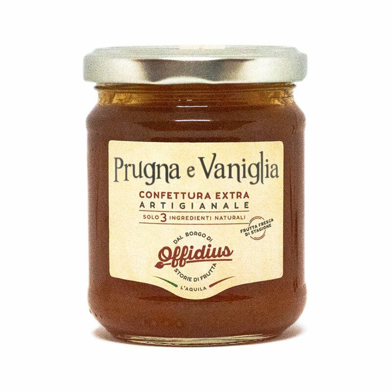 Prugna e Vaniglia gr.220 La prugna è uno di quei frutti che si apprezza solo quando piace veramente. La sua confettura è invece molto gradevole e accontenta un po’ tutti i palati. La si apprezza soprattutto quando non ci si aspetta molto e proprio in quel caso si rimane piacevolmente sorpresi. Ancora più gradevole è quando si scopre il profumo della bacca di vaniglia. Disponibile anche nel vaso mini da 35 g Ingredienti: Prugne, zucchero, succo di limone, bacca di vaniglia. Bourbon del Madagascar. Puo’ contenere frammenti di noccioli. Dopo l’apertura conservare in frigorifero alla temperatura di 4°C e consumare in tempi brevi. Ogni 100 g di prodotto finito si utilizzano >130 g di frutta.