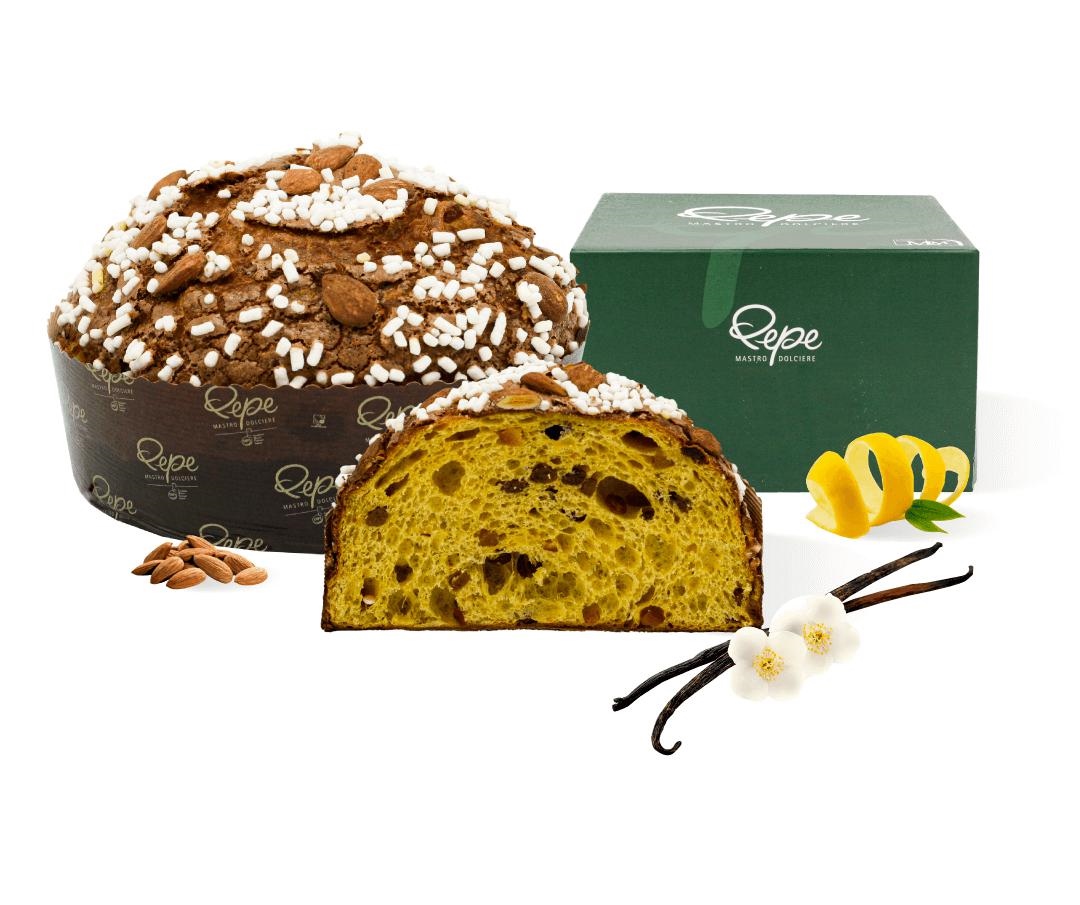 La ricetta del classico panettone Pepe sposa la croccantezza delle mandorle e il dolce dello zucchero, in una glassa dai sapori inconfondibili.