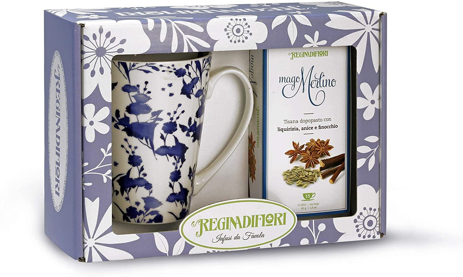 Scatola vetrina con Mug in porcellana e tisana Mago Merlino 15 filtri x 3g. Il sapore della liquirizia abbinato al finocchio, da infondere e gustare nella bellissima mug in porcellana decorata con i fiori di un magico giardino! Un regalo prezioso da degustare nei momenti di relax per lasciarsi avvolgere da una spirale di profumi e ritrovarsi a sognare, come in una favola!