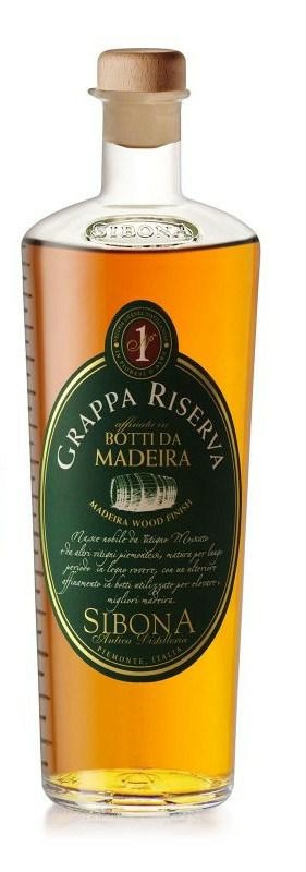 Formato bottiglia: cl.150 Materia prima: Vinacce di Moscato, da uve raccolte fresche durante la vendemmia e selezionate Sibona. Distillazione: Totalmente in proprio, in alambicchi di rame, grazie alla sapiente esperienza dei nostri enologi-mastro distillatori. Affinamento: per lungo periodo in vasche d’acciaio inossidabile Invecchiamento: prima per 2 anni in botti di media capacità di rovere classico ed in seguito in botti di Madeira per ulteriori 2 anni (totale permanenza in legno 4 anni). Gradazione: 44% vol. Bottiglia: speciale ed elegante bottiglia graduata Sibona con tacche laterali indicanti il contenuto e beccuccio versatore. Astuccio: Elegante astuccio cilindrico, con chiusura superiore. Questa speciale Grappa Riserva di Moscato, già invecchiata, per un lungo periodo, in legno rovere (2 anni) è stata in seguito messa a riposo per diversi mesi (24 mesi) in botti, provenienti dall’isola di Madeira e già utilizzate, in precedenza, per elevare il “Madeira” delle più prestigiose cantine. La particolare permanenza in botti da Madeira, già utilizzata nei Whisky, è stato da noi sperimentato in maniera innovativa sulla Grappa e con risultati eccezionali dal punto di vista qualitativo. Il profumo coinvolgente e fruttato ed il sapore ricco, raffinato e con retrogusto floreale, richiamano molto quello del Madeira già contenuto in queste botti.