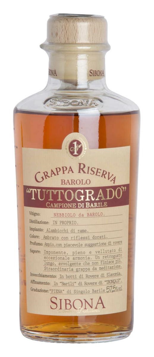 Formato bottiglia: cl.50 Gradazione alcolica: 57,5% vol. Prodotta in Italia. Grappa ottenuta da vinacce del vitigno Nebbiolo da Barolo, noto come il “re dei vini”, e provenienti dai vigneti storici delle zone di Barolo, Serralunga, Monforte, La Morra. La vinaccia, che arriva fresca in distilleria viene avviata nello stesso giorno alla distillazione per cogliere il massimo e dei profumi e degli aromi. Segue un primo invecchiamento in botti di media capacità, quindi un ulteriore e prolungato invecchiamento in piccoli barili di rovere del limousin. Giunta al termine dell’invecchiamento la grappa di ogni singolo barile viene imbottigliata. Caratteristiche organolettiche Colore: Ambrato con riflessi dorati. Profumo: Ampio, con piacevole suggestione di rovere. Sapore: Imponente, pieno e vellutato di eccezionale armonia. Un retrogusto lungo, avvolgente che non finisce più. Straordinaria grappa da meditazione.