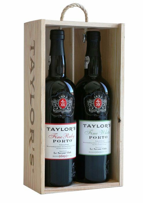 Cassa legno con 1 Bottiglia di Taylor's Fine Ruby e 1 bottiglia di Taylors's Select. Taylor's Fine Ruby: Blend di vini di diversi invecchiamenti, è un Porto giovane, fruttato e di buon corpo, dolce e ricco di colore. Ottimo in accompagnamento al melone o a dessert a base di frutta. Taylor's Select: Affinato per 3 anni in botti di rovere, è giovane e fruttato, di colore rosso rubino e di buon corpo. Per il suo gusto asciutto e delicato, è eccellente come aperitivo.