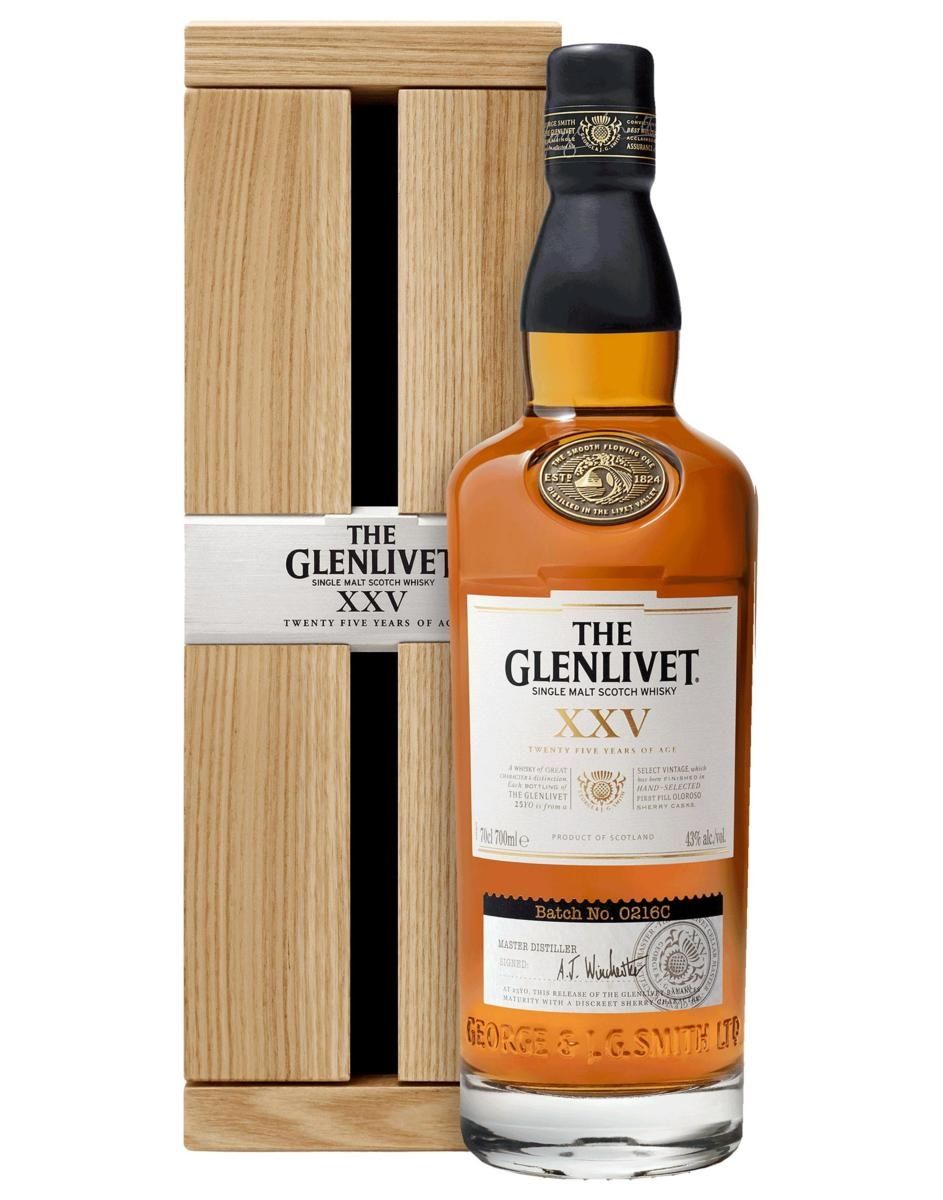 Formato bottiglia: cl.70 Prodotto in Scozia. Con astuccio in legno. XXV è uno Scotch Whisky a malto singolo dello Speyside che affina per 25 anni in botti di rovere che precedentemente contenevano sherry Oloroso, un whisky di preziosa fattura che rappresenta la vetta più alta di casa Glenlivet. Di colore ambra con sfumature dorate, porta al naso profumi eleganti di cioccolato fondente, noci tostate e uva sultanina. Il gusto è vellutato ed equilibrato, con sentori di zenzero e cannella. Ottimo da servire liscio, è perfetto in compagnia di formaggi delicati e cremosi come il Camembert.