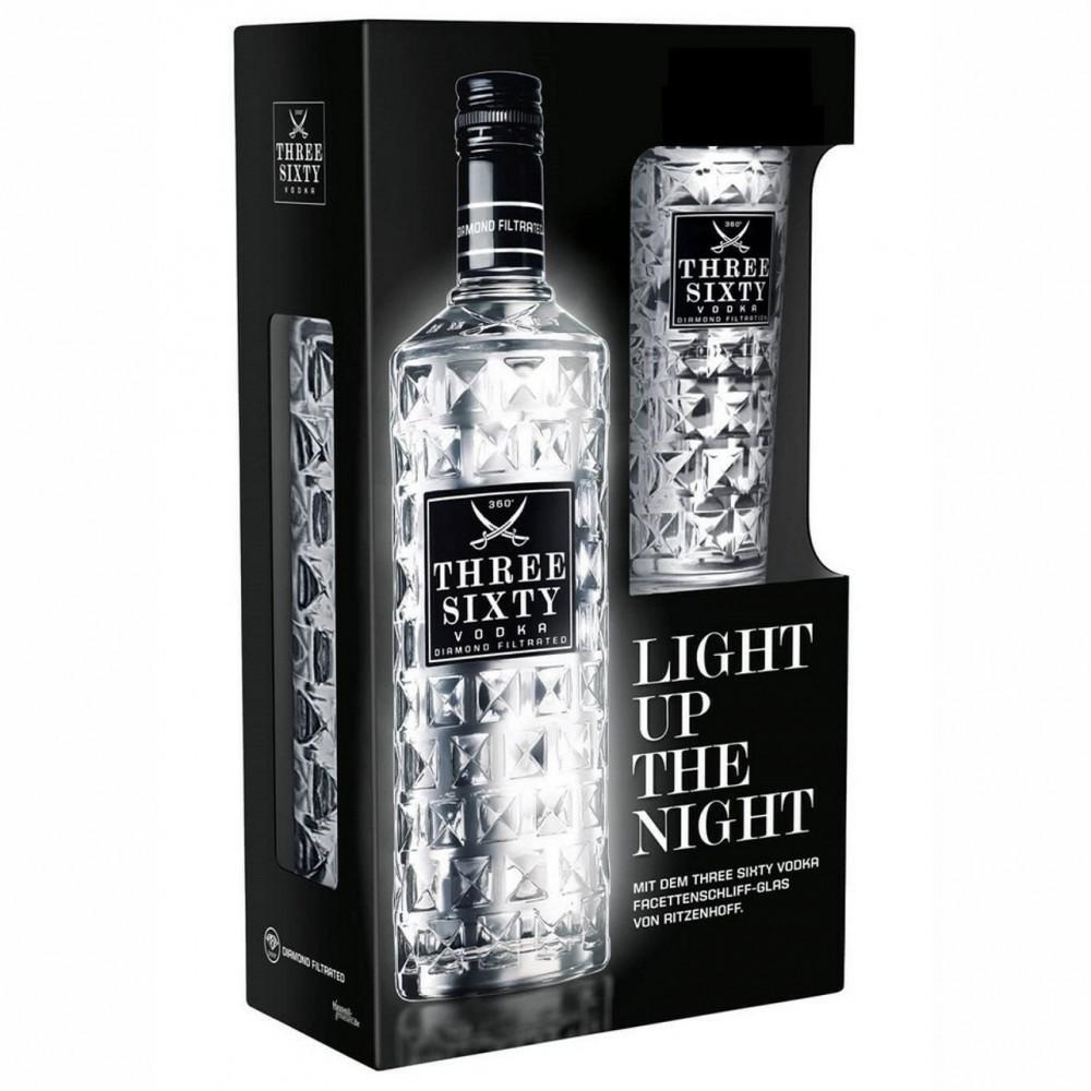 Confezione con bottiglia cl.70 e bicchiere. Gradazione alcolica: 37,5% vol. Three Sixty Vodka è estremamente pura, dal gusto morbido, ben bilanciato e sofisticato. Il suo packaging è unico, grazie ad una bottiglia in vetro totalmente trasparente e brillante, con forme in rilievo che richiamano i tagli del diamante e un’etichetta di velluto nero.