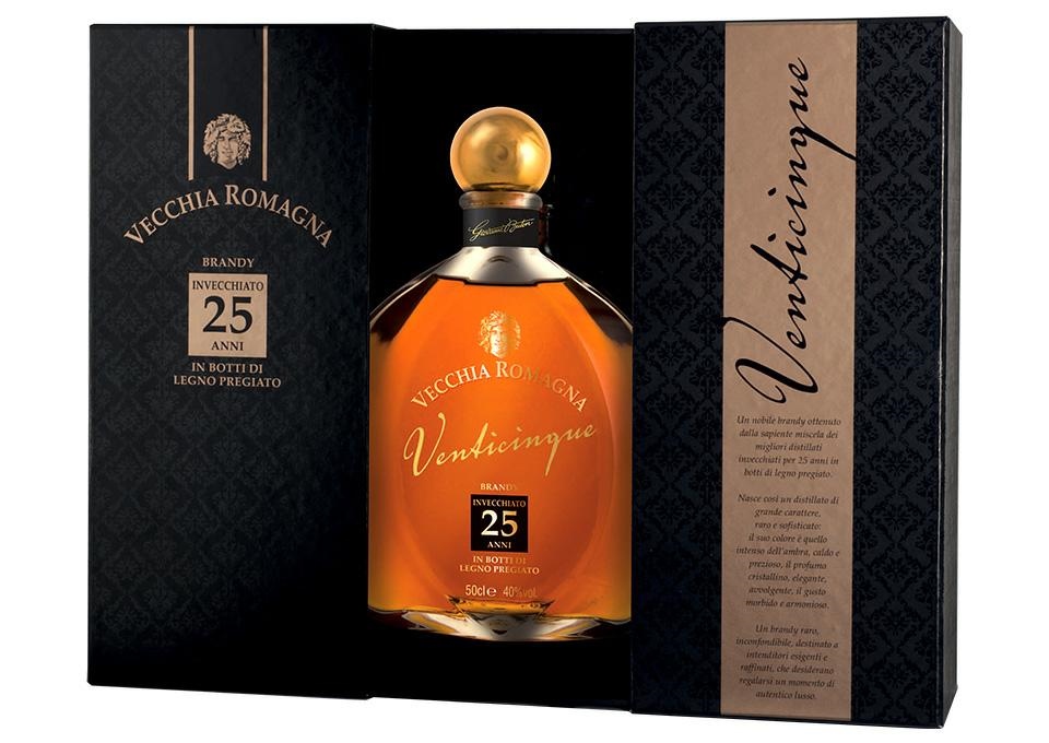 Formato bottiglia: cl.50 Gradazione alcolica: 40% vol. Con cofanetto. Nobile brandy, ottenuto dalla sapiente miscelazione dei migliori distillati che invecchiano per 25 anni in botti di legno pregiato. Si caratterizza per un colore ambra intenso e caldo. Al naso espone un profumo avvolgente ed elegante, in cui si susseguono sentori floreali di violetta, glicine e iris, per poi lasciare la scena ad uvetta sotto spirito e zenzero candito. Al palato si rivela sofisticato, armonioso e morbido, terminando su un finale speziato inconfondibile e unico. Destinato ad intenditori esigenti e raffinati, che desiderano regalarsi un momento di autentico lusso.