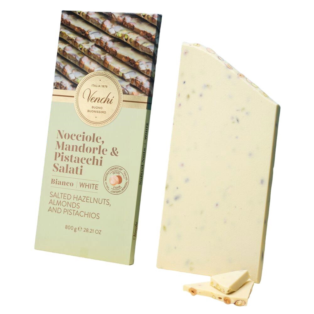 Gr.800 Maxi tavoletta da 800gr di cioccolato bianco con frutta secca leggermente salata intera: la vesione maxi della classica tavoletta bianca con almeno il 30% di frutta delicatamente salata nel mix di nocciole Piemonte I.G.P., mandorle e pistacchi interi. Un cioccolato che stupisce ad ogni morso per il piacevole contrasto fra la cremosità del cioccolato bianco e la croccantezza della frutta secca, e per l'armoniosa contrapposizione di note dolci e salate. Da gustare e condividere anche durante un aperitivo,grazie al suo formato maxi. Perfetto anche in abbinamento con un prosecco. Il formato maxi-tavoletta è perfetto per un regalo alternativo a una scatola di cioccolatini, per chiunque sia goloso del cioccolato con frutta secca.