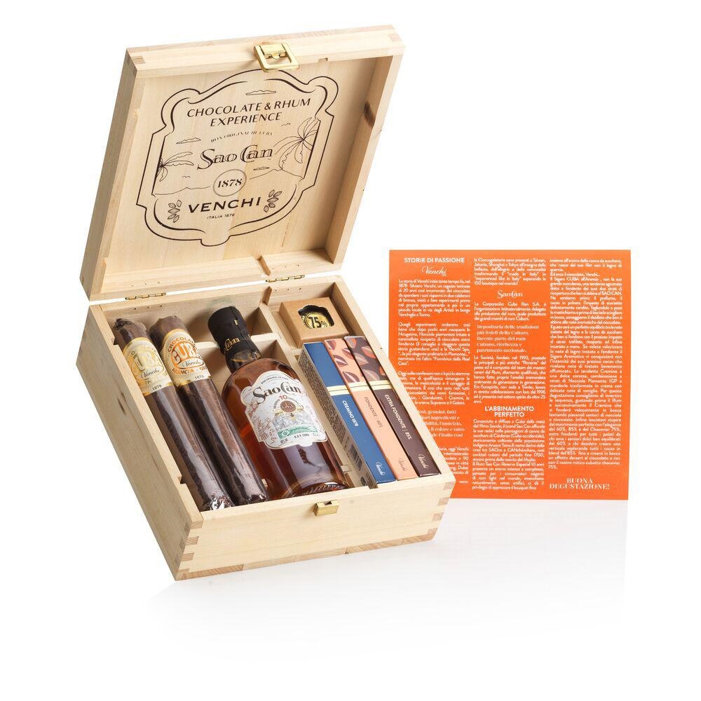Confezione in legno con una bottiglia cl.20, tre tavolette, due sigari al cioccolato e due cioccolatini. Un viaggio tra i sapori, alla scoperta di un abbinamento tanto tradizionale quanto vincente. La collaborazione con la Corporaciòn Cuba Ron S.A., nasce dalla volontà di rimanere fedeli alla cultura facente parte del rhum Cubano. Un team di maestri roneri del rhum, altamente qualificati, ha fatto propria l’eredità tramandata oralmente da generazione in generazione, lavorando sapientemente il rhum Sao Can Reserva Especial 10 anni, dall'aroma intenso e complesso, invecchiato naturalmente e senza artifici. Inizia così un percorso sorprendente, partendo dai sigari di cioccolato, nelle versioni cacao aromatico e arancia, per giocare con gli accostamenti fondenti e agrhumati. La tavoletta Cremino lascia spazio ad una dolce carezza di strati alternati di Nocciola Piemonte IGP e note di vaniglia. Nota di chiusura, il connubio perfetto tra rhum e cioccolato, con l'eleganza delle nostre ricette fondenti in differenti percentuali di cacao 60%, 75% e 85%.