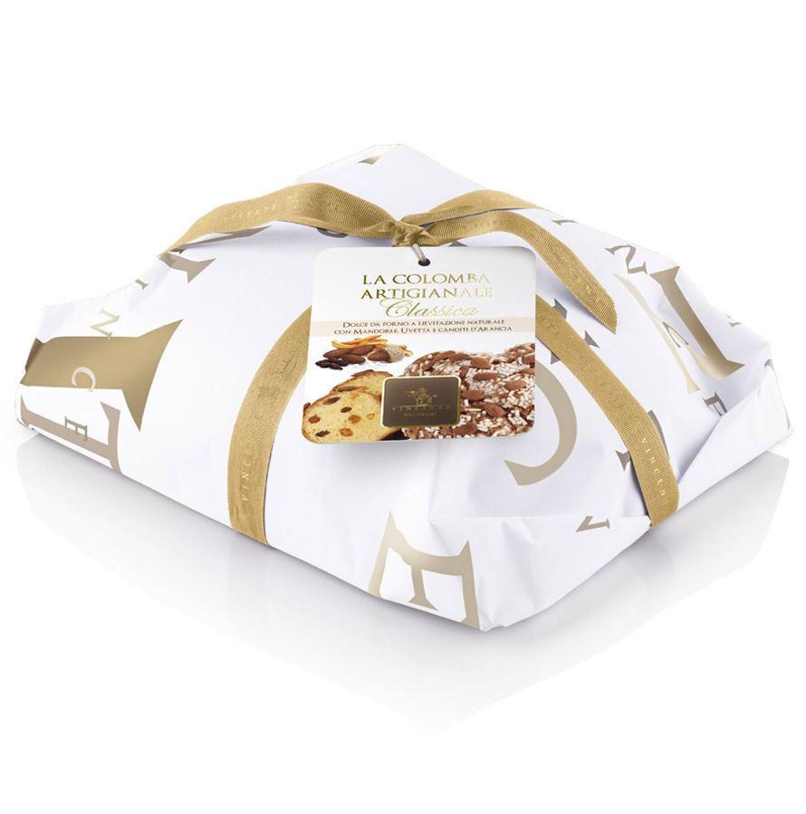 Una colomba artigianale con una glassa croccante ricoperta di granelli di zucchero e mandorle siciliane.
