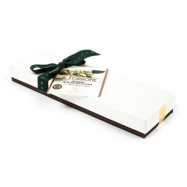 Torrone morbido al pistacchio di Sicilia 200gr. Ingredienti: Pistacchio di Sicilia 60%, zucchero, miele, albume d'uovo, sciroppo di glucosio, olio essenziale di vaniglia. Ricopertura: ostia (Fecola di patate, olio di girasole) Può contenere altra frutta secca a guscio e soia.