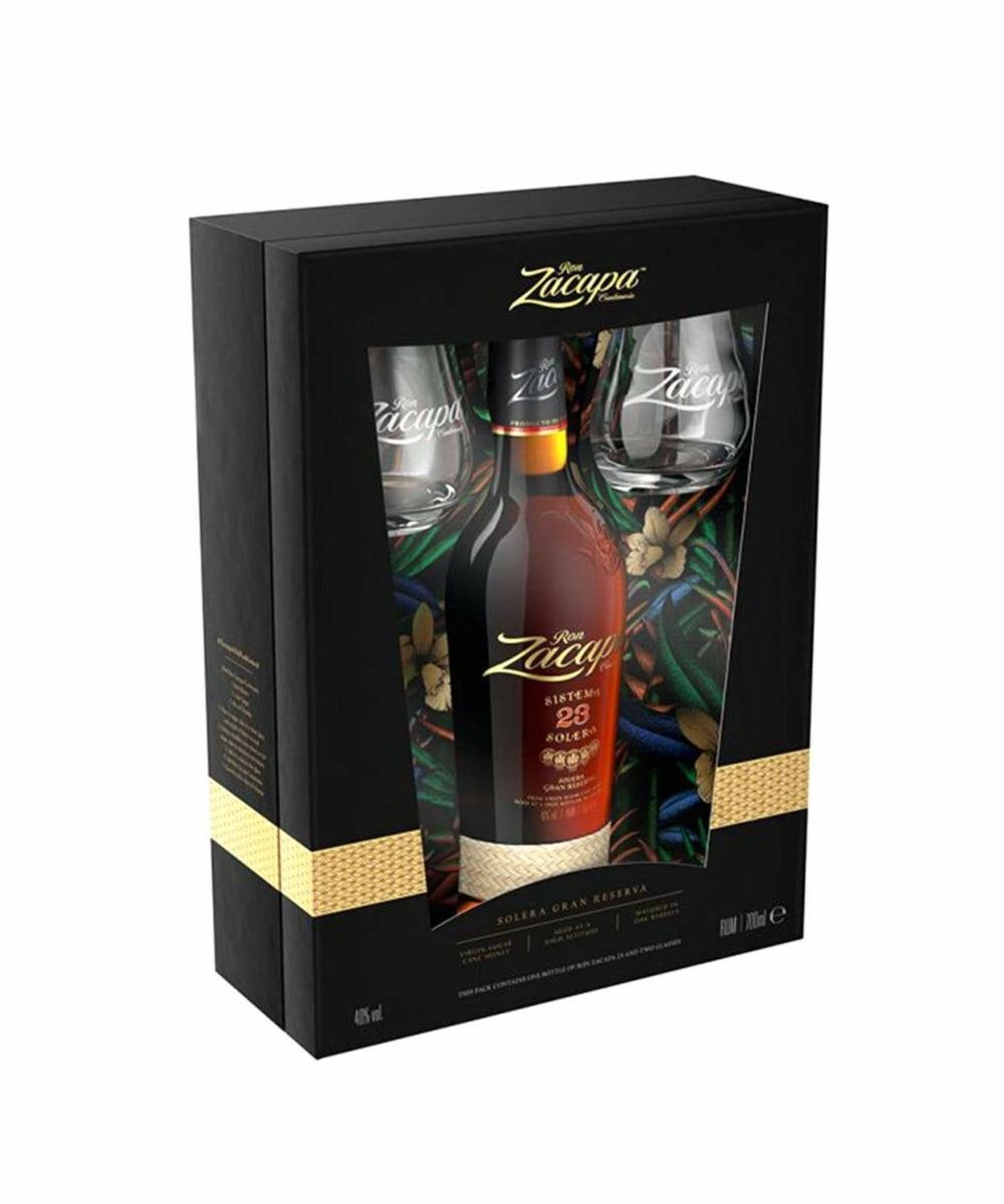 Confezione con bottiglia cl.70 + due bicchieri. Gradazione alcolica: 40% vol. Uno splendido simbolo, forse l’emblema, ma senz’altro un’icona del Guatemala: Ron Zacapa 23 Gran Solera è, fra i rum invecchiati, un capolavoro assoluto, tra i migliori rum esistenti al mondo. Nasce da un blend di rum giovani e rum invecchiati fra i 6 e i 23 anni e affina secondo un nuovo sistema di invecchiamento: il Solera dinamico. Un sistema, inventato in Spagna più di cinque secoli fa, che prevede l’utilizzo di botti di rovere bruciate che prima contenevano bourbon, Sherry o Porto, che conferiscono al distillato un profumo morbido e complesso con sentori di frutta matura e note speziate di noce moscata, cacao e liquirizia. Impossibile non riconoscere quel suo particolare retrogusto leggermente zuccherino di miele vergine. Un colore ambrato intenso, penetrante. Un naso inebriato da sentori di frutta esotica e frutta secca. Infine un sorso pieno, morbido e piacevolmente vellutato. Ma è forse l’invecchiamento (oltre al clima e al territorio) a conferire a questo Zacapa quel carattere inconfondibile che lo rende unico al mondo. L’altitudine alla quale è posizionata la Casa sopra le Nuvole (2333 mt s.l.d.m.) consente un lento e paziente scambio tra legno e distillato, fino a quando non avrà raggiunto un gusto armonico, piacevole, equilibrato. Ottimo come dopocena, Zacapa 23 Gran Solera esprime appieno l a propria personalità se accostato a un buon sigaro e a del cioccolato fondente.